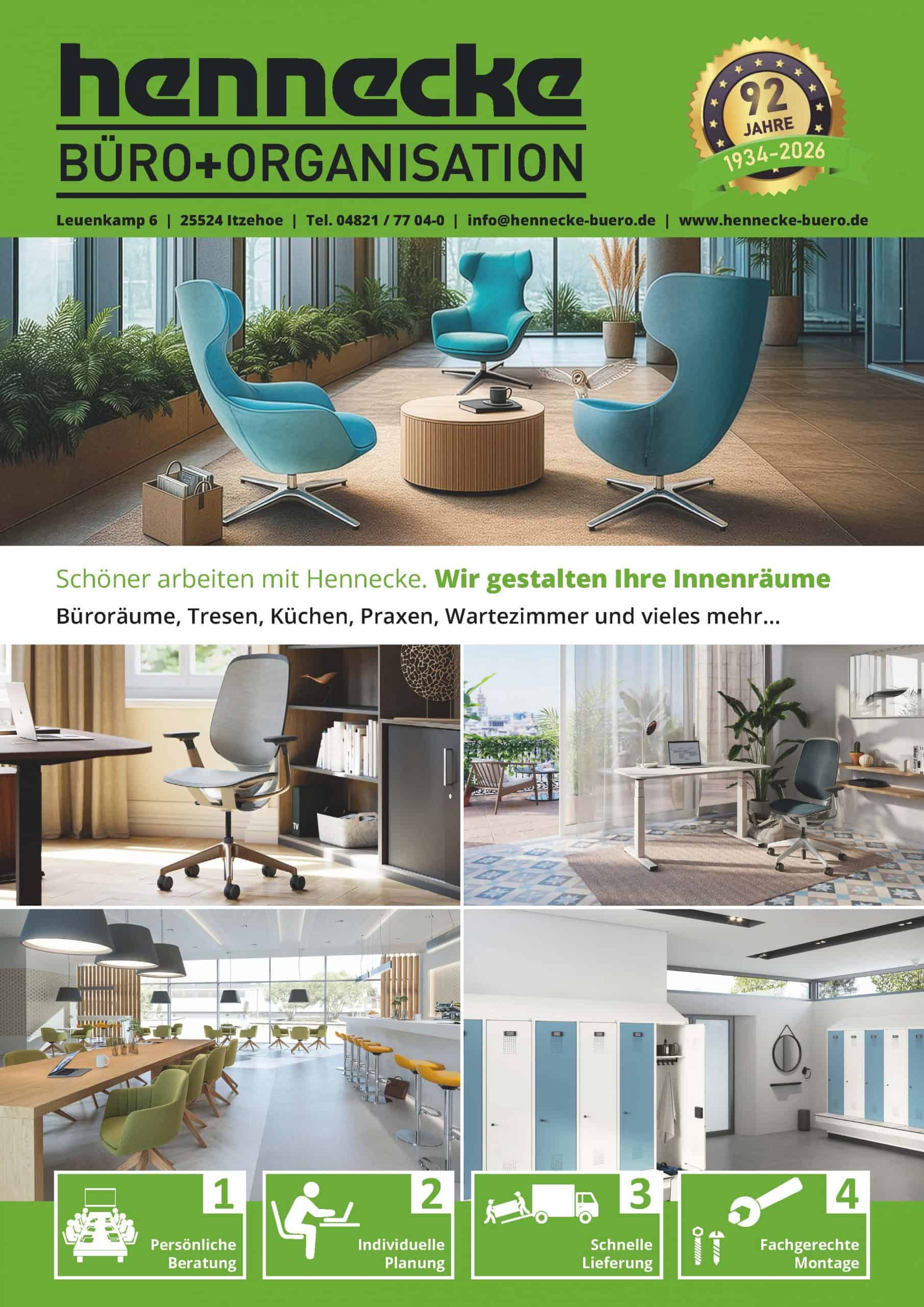 Ich habe öfters bei der Fa. Hennecke gekauft. Meistens waren es Kleinigkeiten. Nun habe ich mein Büro in Krempe erweitert und habe neue Möbelausstattung benötigt. Frau Hennecke hat sich, obwohl ich keinen Termin vereinbart habe und lediglich spontan vorbei gekommen bin, sehr viel Zeit gelassen und mich wirklich gut und ehrlich beraten. Das Gesamtangebot preislich war in Ordnung. Die Lieferung erfolgte prompt, die Handwerker waren sehr freundlich und haben sauber gearbeitet (ist heutzutage leider keine Selbstverständlichkeit mehr…)