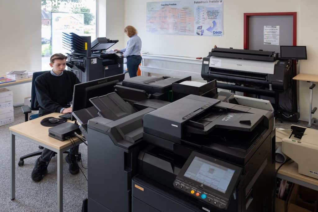 Besuchen Sie unseren modernen Copyshop! Bei uns erhalten Sie eine große Auswahl von Dienstleis- tungen zu fairen Preisen. Unsere hochmodernen Multifunktionsgeräte bieten eine Vielzahl von Möglichkeiten, darunter Großformate bis DIN AO, Laminierungen bis DIN A1 und die Digitalisierung von Bauplänen. Wir bieten auch hochwertigen Fotodruck auf Fotopapier sowie Druck- und Bindeservices für Bachelorarbeiten, Examensarbeiten und Projektarbeiten mit verschiedenen Bindungsoptionen.
